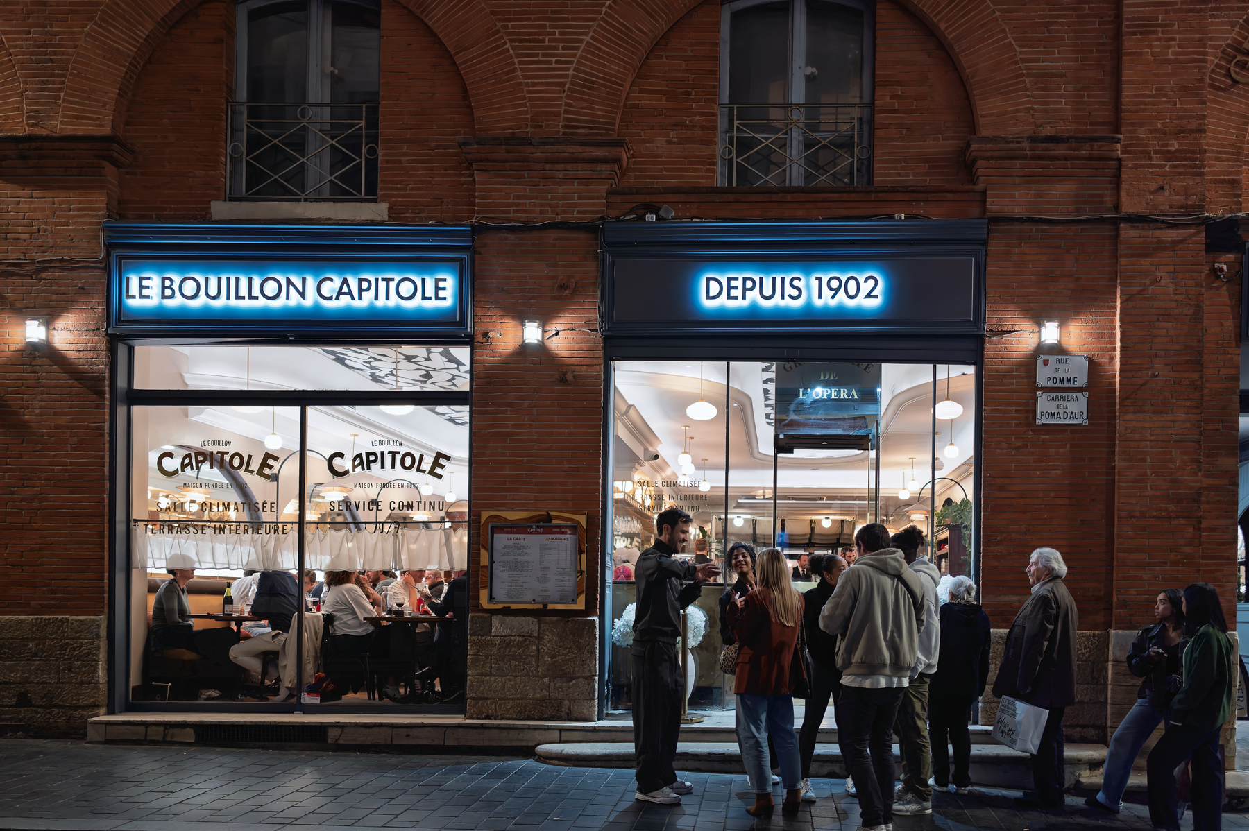 FR : Fondé en 1902, Le Bouillon Capitole est une véritable institution toulousaine. Situé rue de la Pomme, à deux pas de la place du Capitole, il perpétue la tradition parisienne des “bouillons”, proposant une cuisine généreuse à prix accessibles. Sa façade lumineuse et son ambiance animée en font depuis plus d’un siècle un lieu emblématique de convivialité, où étudiants, familles et voyageurs se retrouvent pour partager un repas.