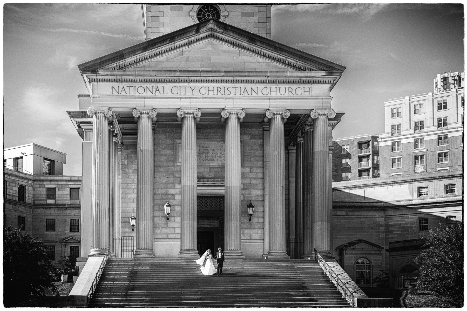 Beneath the towering columns of National City Christian Church, a wedding couple steps into the light. Designed by John Russell Pope, architect of the Jefferson Memorial, the neoclassical grandeur becomes a stage where history and intimacy meet.