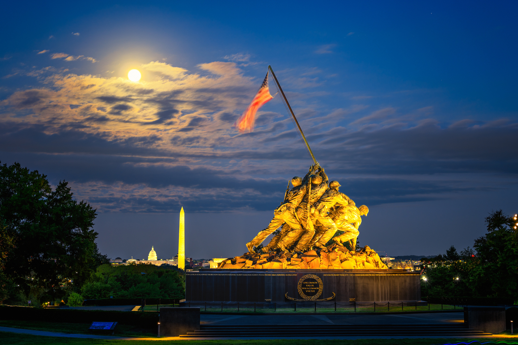 The October 2025 Harvest Moon rises over Arlington’s Marine Corps War Memorial, its glow breaking through clouds above the illuminated bronze figures of the Iwo Jima flag raising. In the distance, the Washington Monument and U.S. Capitol shine in alignment — a solemn reminder of sacrifice framed against the nation’s capital.