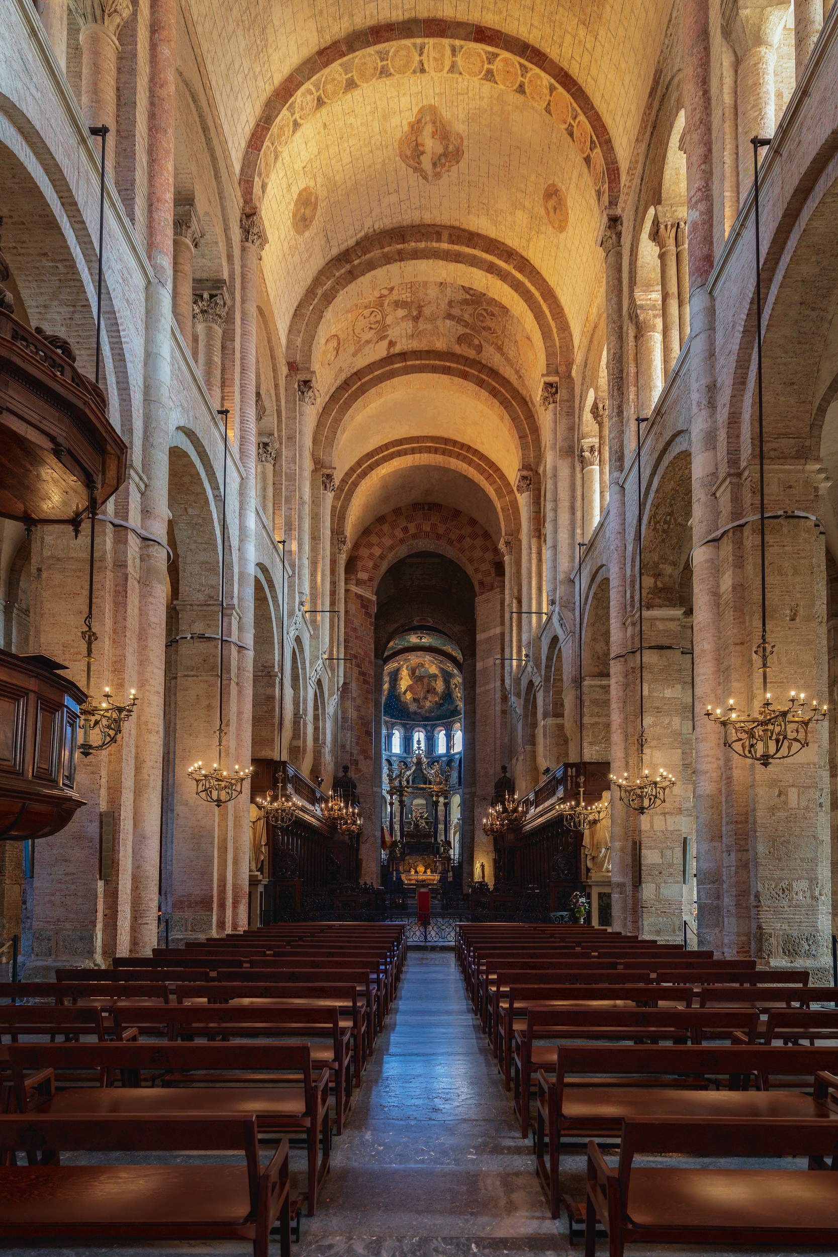 EN : Interior of the Basilica of Saint-Sernin in Toulouse, one of the largest Romanesque churches in Europe and a major stop on the medieval pilgrimage route to Santiago de Compostela. Its vast nave, with soaring arches and frescoed ceilings, reflects the grandeur of 11th–12th century architecture.