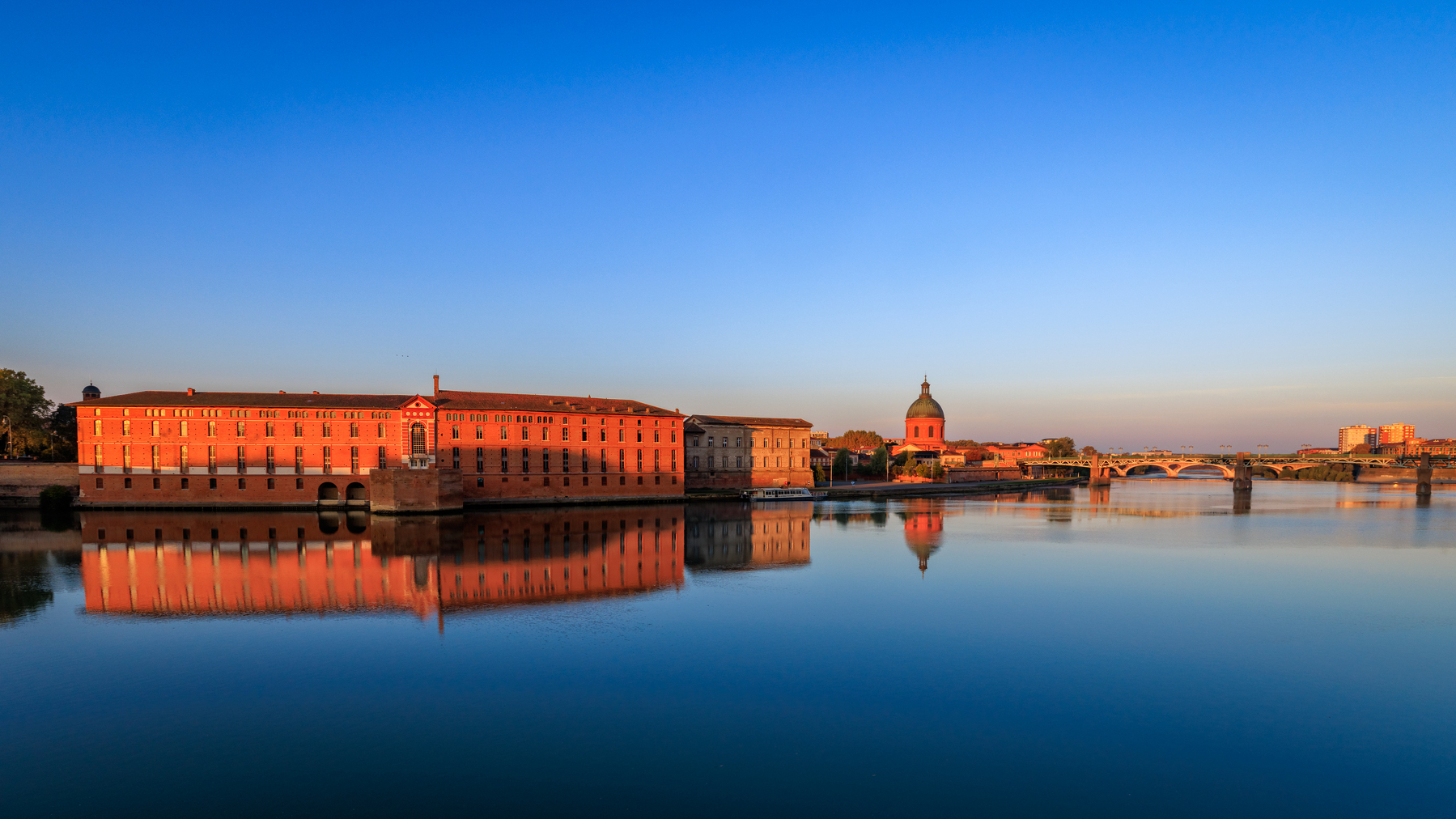 FR: Au lever du soleil, l’Hôtel-Dieu Saint-Jacques et le Dôme de La Grave s’illuminent de teintes dorées, reflétées dans les eaux calmes de la Garonne. Le Pont Saint-Pierre complète ce tableau intemporel de l’architecture toulousaine en briques et du patrimoine des quais.