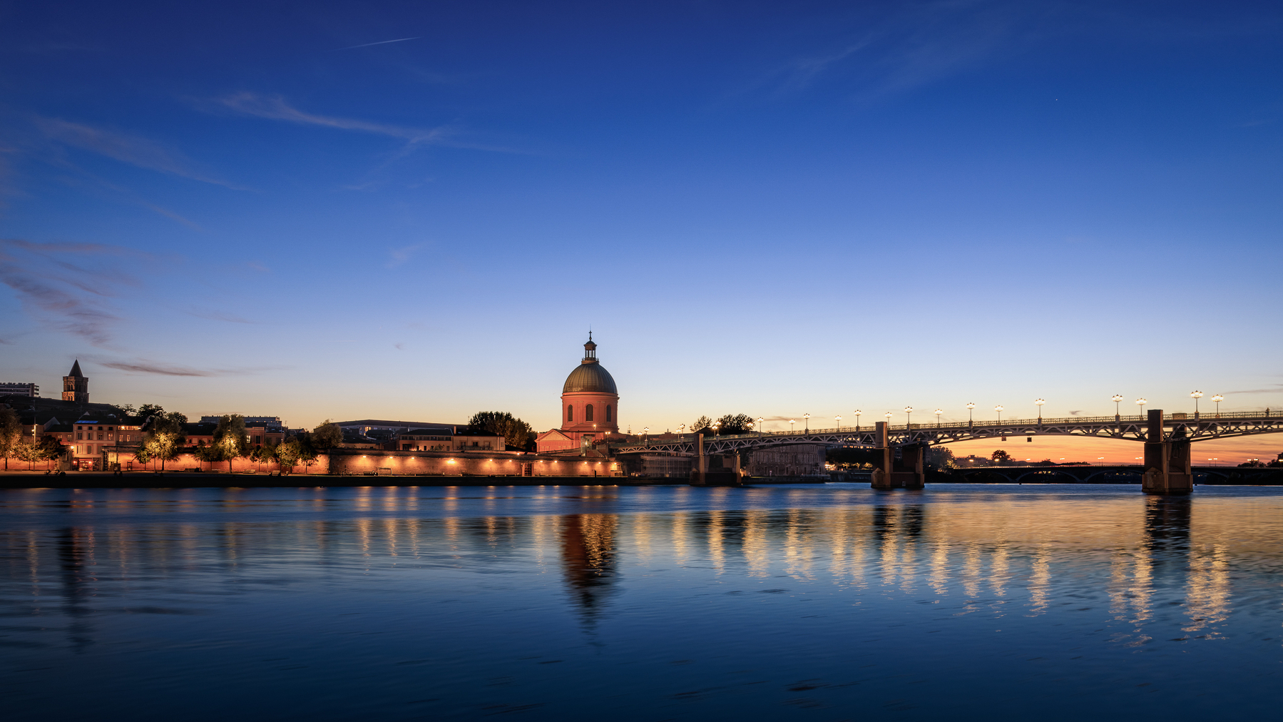 EN: The Dôme de La Grave and the Pont Saint-Pierre at twilight, reflected in the calm waters of the Garonne. Toulouse, October 2025.