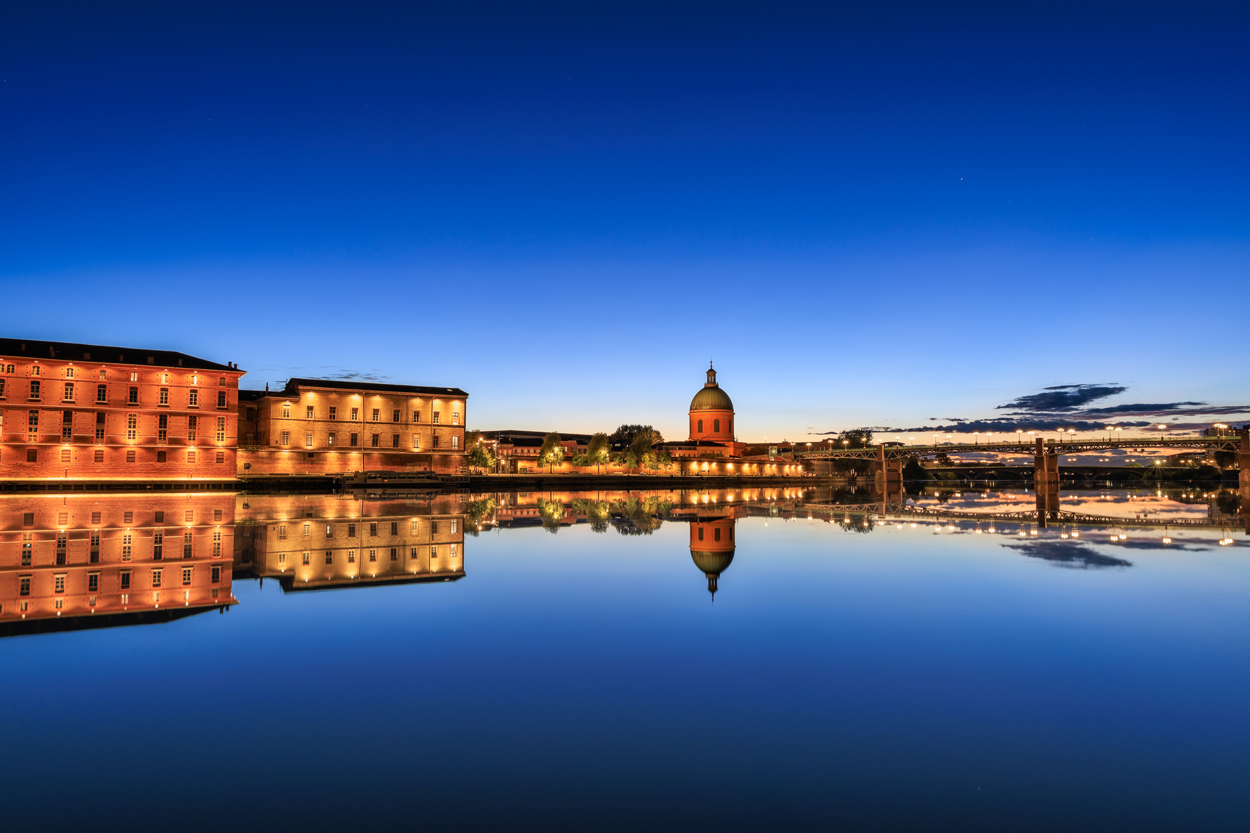 FR: Reflets de l’Hôtel-Dieu Saint-Jacques, du Dôme de La Grave et du pont Saint-Pierre illuminant la Garonne au crépuscule. Jadis lieux d’accueil pour les malades et les pèlerins, ces monuments demeurent aujourd’hui des symboles emblématiques de la « Ville Rose ».
