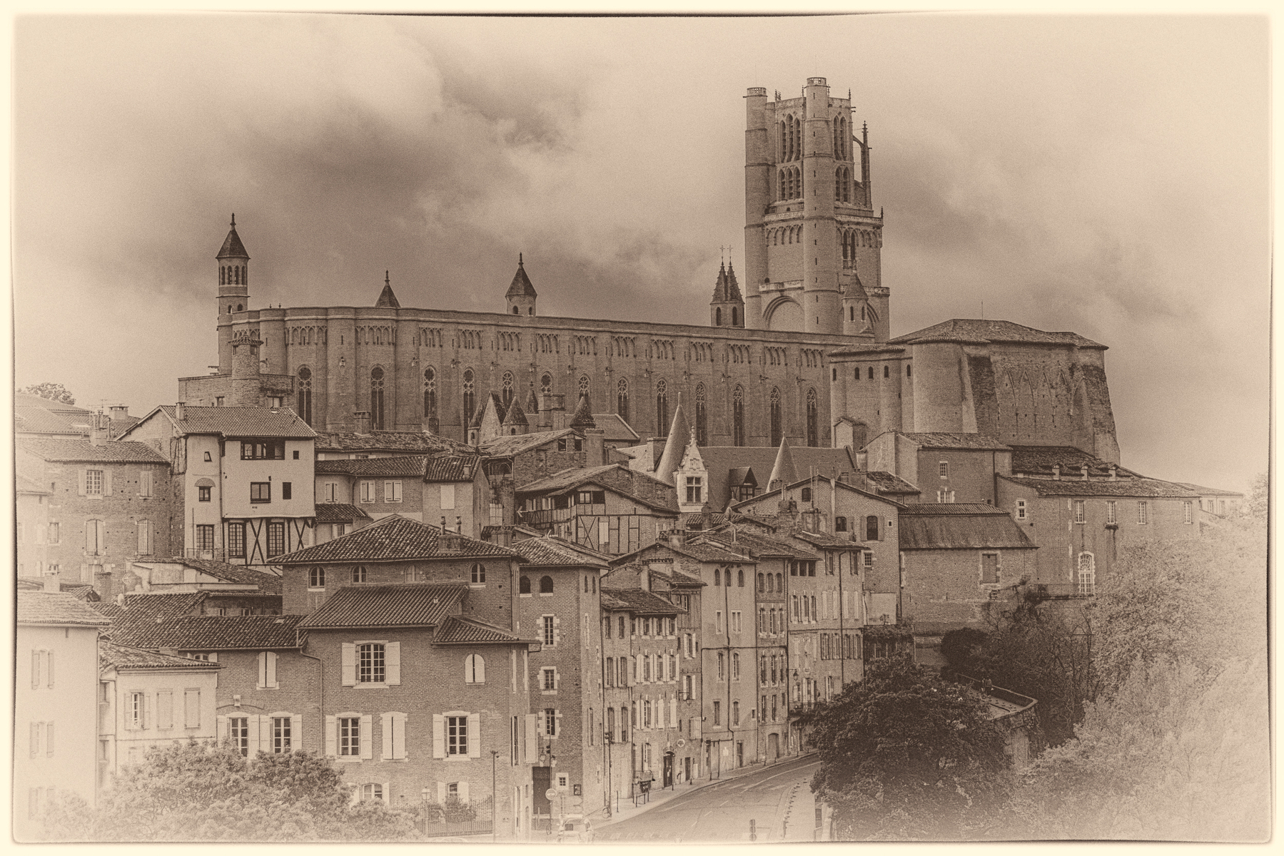 EN: The Cathedral of Sainte-Cécile rises above the old town of Albi, a masterpiece of southern Gothic architecture built entirely of brick. The sepia tones recall its enduring presence through the centuries.