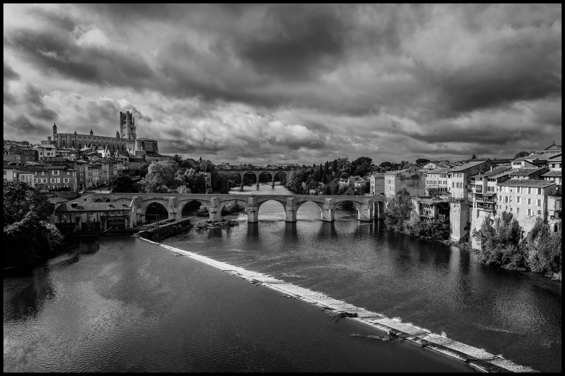 FR: À Albi, le Tarn s’écoule sous le Pont Vieux, pont médiéval du XIᵉ siècle. Dominant la ville, la cathédrale Sainte-Cécile, plus grande cathédrale de brique au monde, incarne la puissance et la mémoire de la cité.