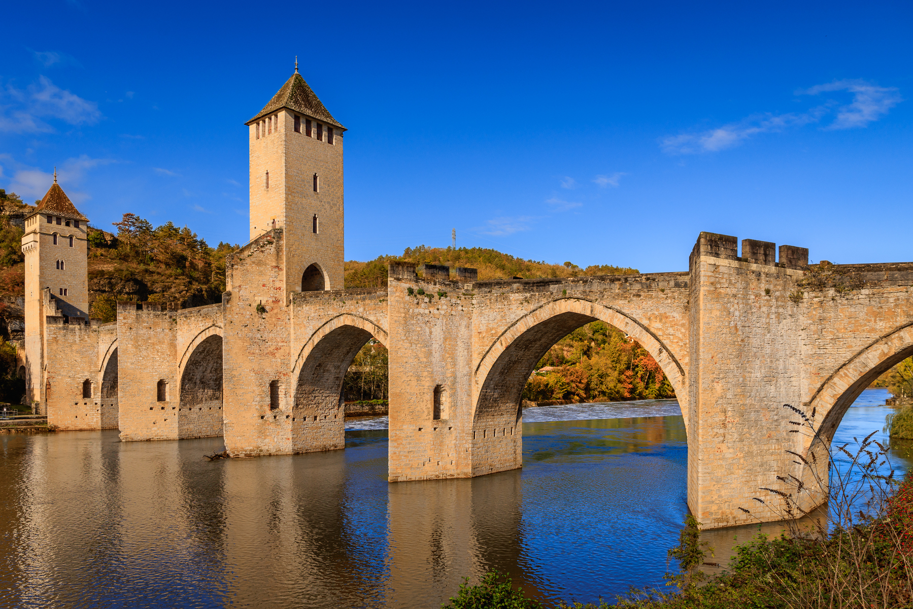FR: Depuis le XIVᵉ siècle, le pont Valentré enjambe le Lot et demeure l’un des plus beaux ponts fortifiés médiévaux de France. Avec ses six arches et ses trois tours, il était à la fois ouvrage défensif et symbole de la prospérité de Cahors. La légende raconte que l’architecte, désespéré de l’achever, conclut un pacte avec le diable — une histoire devenue indissociable de son identité.