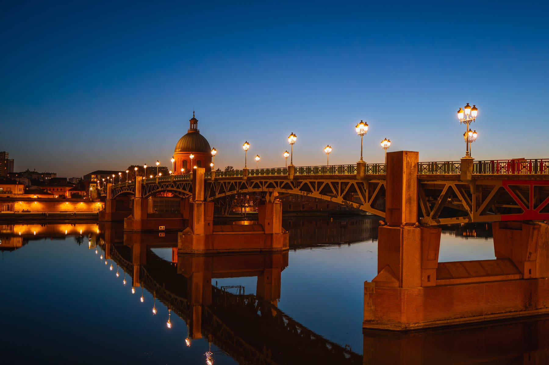 EN: The Pont Saint-Pierre spans the Garonne in Toulouse, linking the city center to the left bank. In the background stands the Dome of La Grave, part of the former hospital founded in the 12th century. The bridge itself, rebuilt in 1987, has become one of the city’s most photographed landmarks, especially at sunset and blue hour.